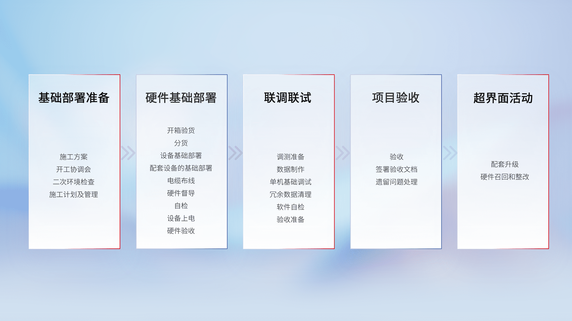 从基础部署准备、、、、硬件基础部署、、联调联试、、、项目验收、、、、越界面活动的全过程可追溯,,保证施工质量和进度。。