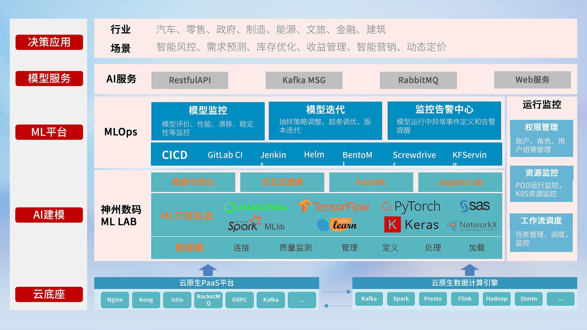 数据+模型双引擎驱动,,面向智能服务场景,,,,快速灵活利用AI技术,,支持业务决策,,,,助力企业智能化转型破局。。